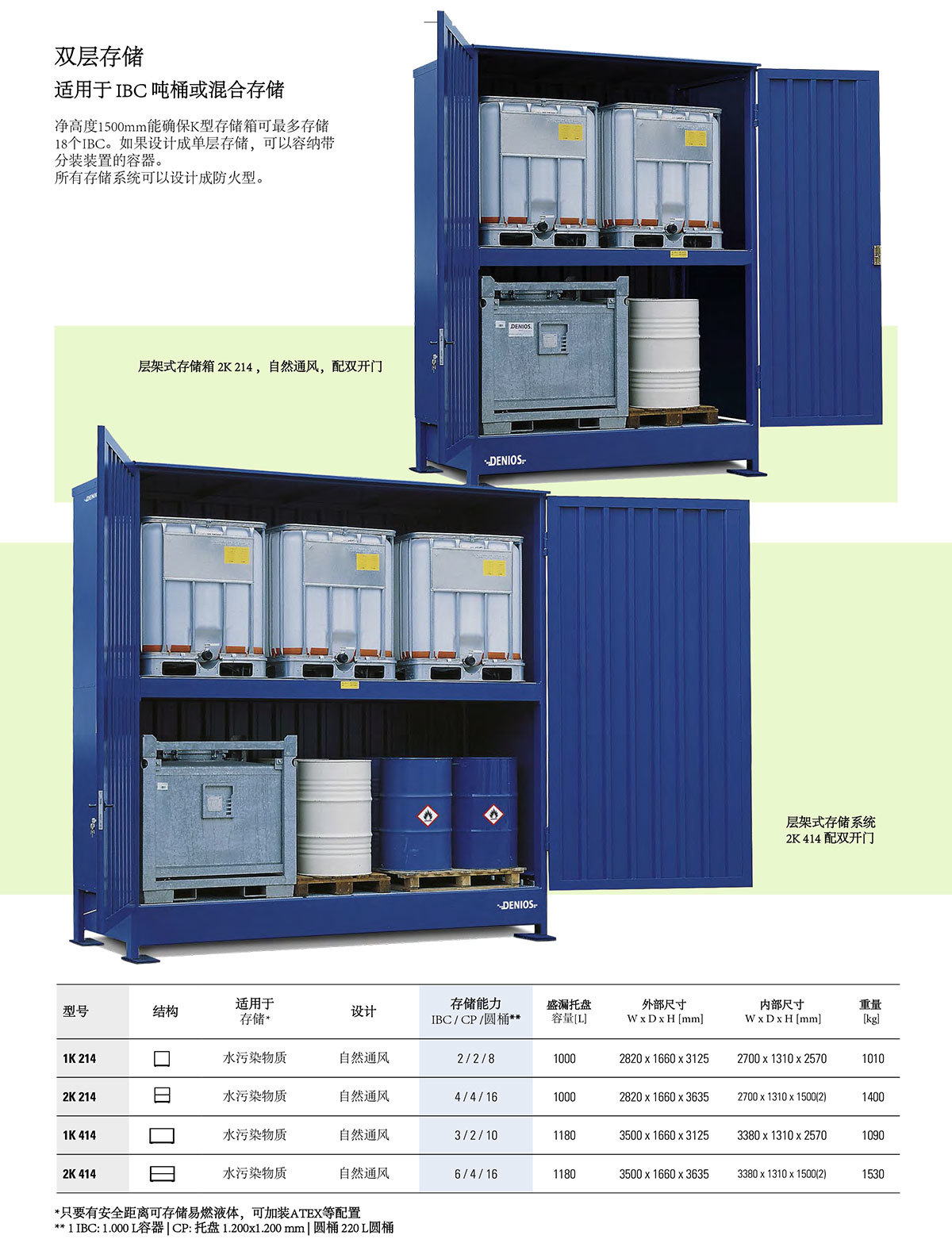 可用于存储4个205升圆桶(在一个化学托盘上)或1个1000升IBC吨桶,